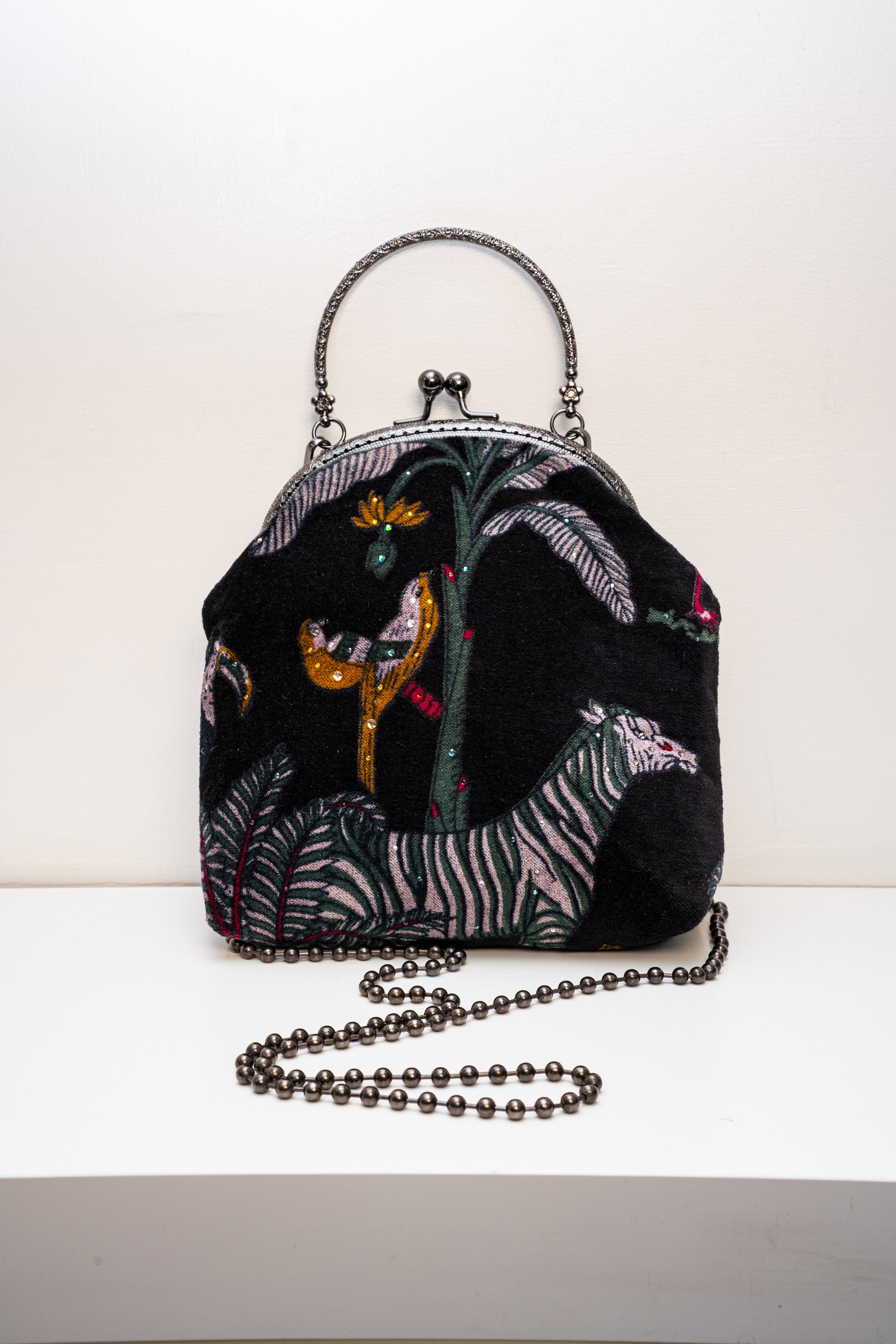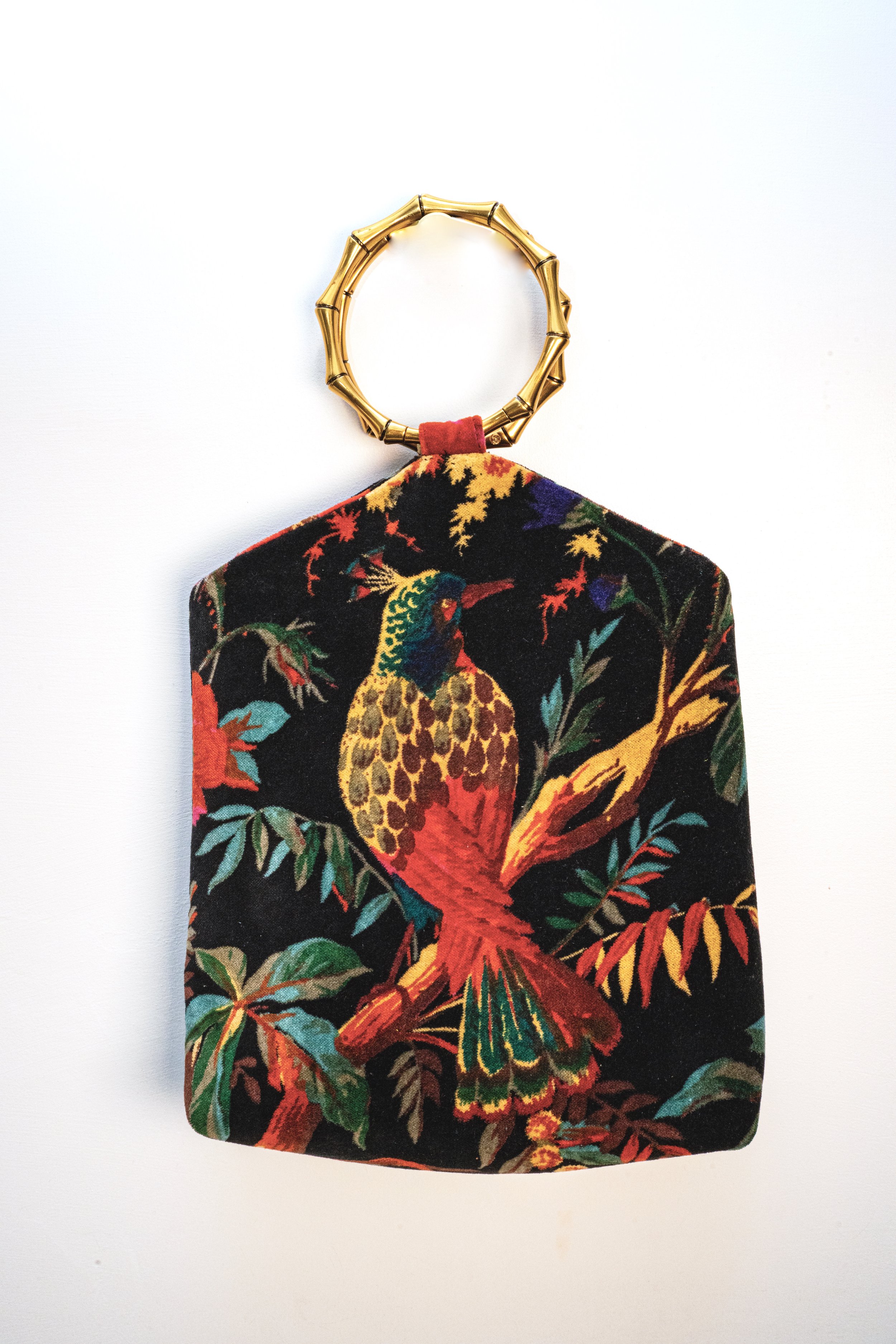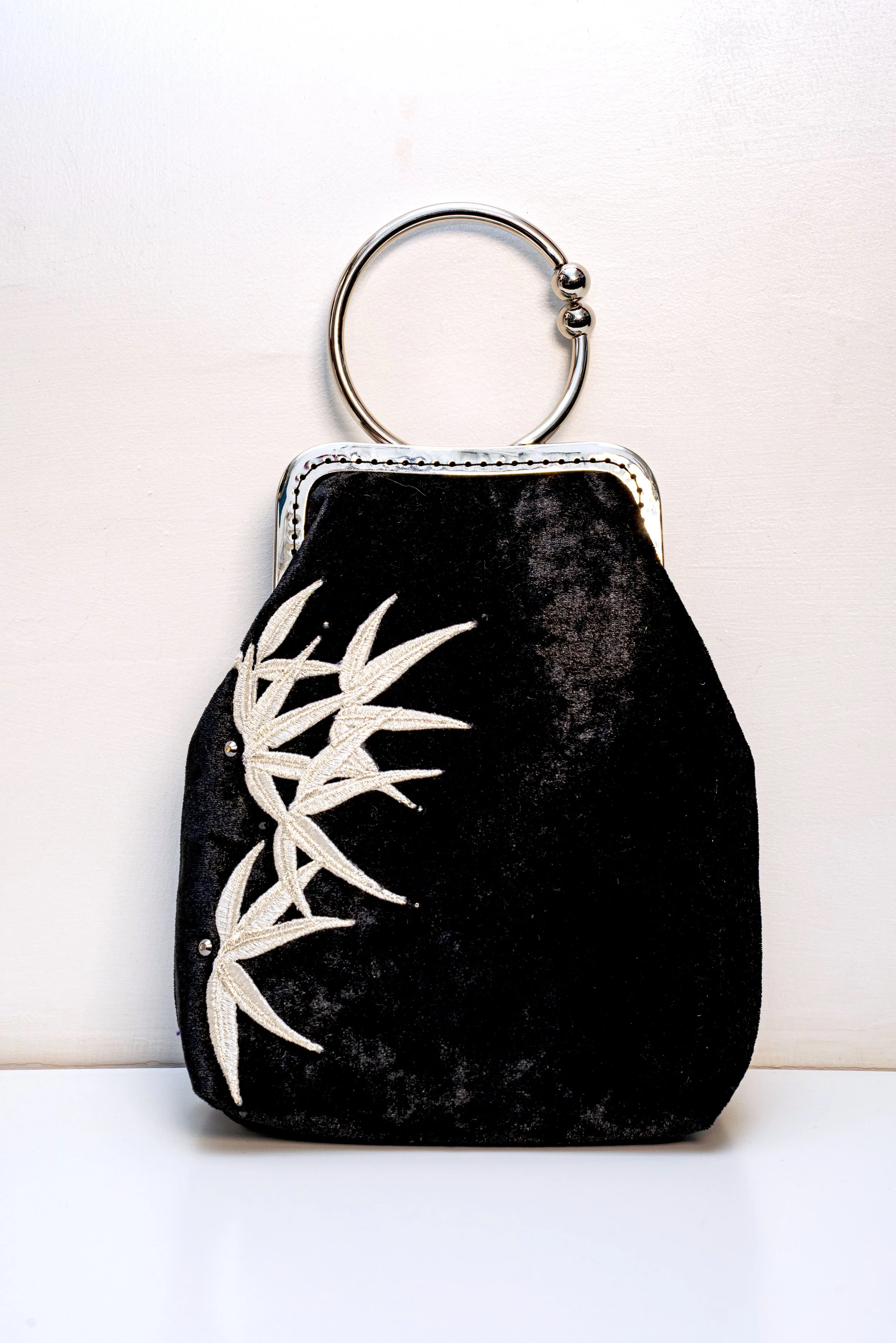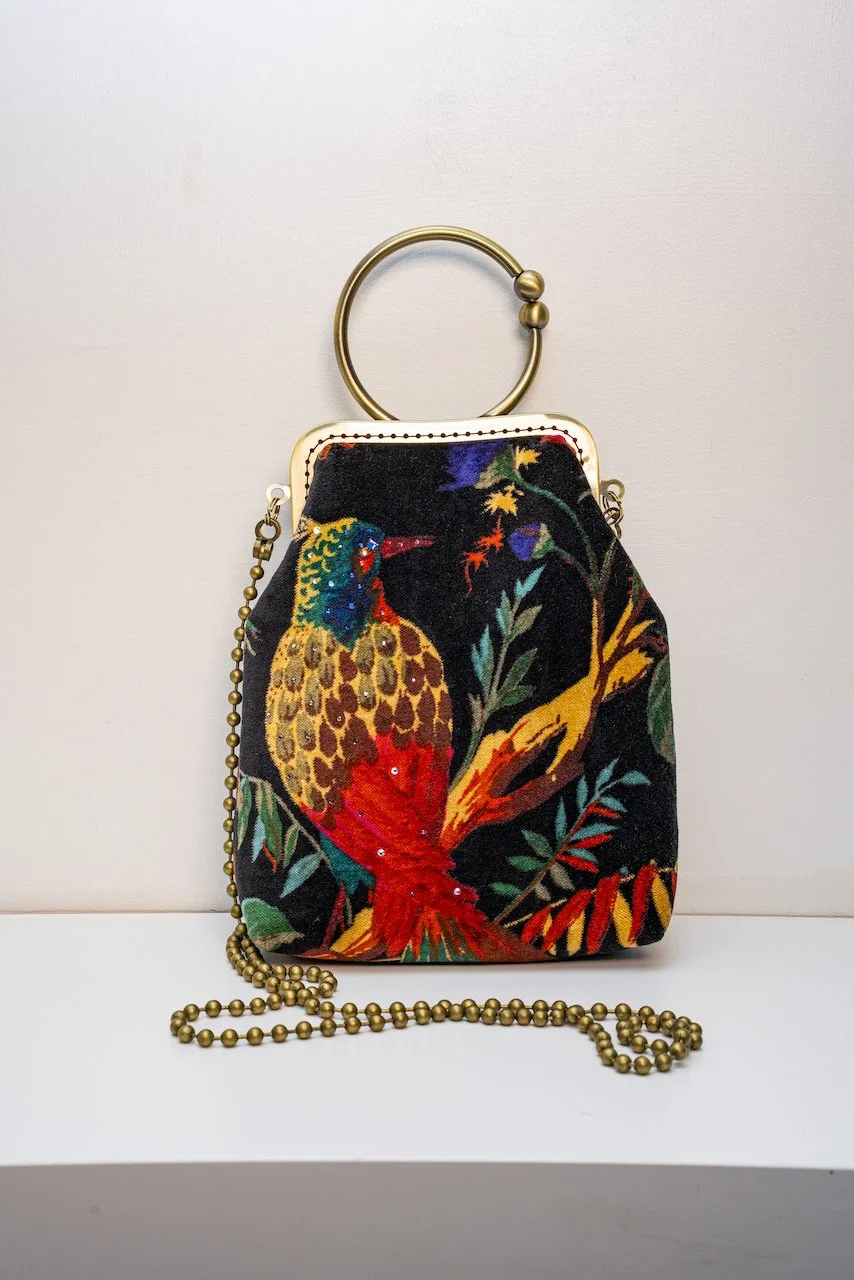 Enhance your style with the Velvet Neo Bag, featuring exquisite Bird of Paradise embroidery and gleaming rhinestone accents.